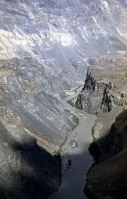 The Bartang (Russian and Tajik: Бартанг, Persian: برتنگ) is a river of Central Asia, and is a tributary to the Panj which itself is a tributary to the Amu Darya. In its middle and upper reaches, it is respectively known as the Murghab and Aksu; it flows through the Wakhan in Afghanistan, then through the Rushon District of the Gorno-Badakhshan autonomous region, Tajikistan. The river is 528 kilometres (328 mi) long (133 km excluding Aksu and Murghab) and has a basin area of 24,700 square kilometres (9,500 sq mi).[1]