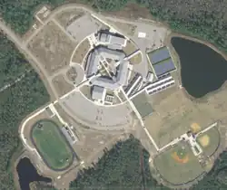 The land for Bartram Trail High School was purchased in January 1999.[66] The school was constructed by Arcadis.[5] The Bartram Trail High School campus takes up one hundred and twenty acres of land and the school building takes up 190,000 square feet (18,000 m2).[5] The school building is a two-story octagon with an open-air courtyard in the center. The cafeteria and media center are located within the main building, while the gymnasium and auditorium with a stage are attached on the south and north sides, respectively.[66] The campus has walkways, student, faculty and visitor parking, a parent drop-off section, a bus loop, a football and track stadium, a baseball and softball field, tennis courts, general-use play fields, a stormwater treatment facility, water and sewer utilities and a wetland mitigation area.[5]