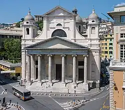 In the early 17th century the rich Baroque decoration was executed, with Andrea Ansaldo in charge of completing the works, and in particular the dome. The current Neoclassicist façade dates to 1830–1840s, designed by Carlo Barabino. The church was damaged by Allied bombings during World War II.