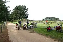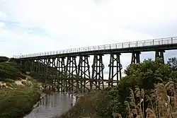 From Anderson to Kilcunda the trail drops 40 metres (130 ft) in height as it winds down through farming country. The rail trail at Kilcunda is built on the coastal sand dunes and incorporates a landmark trestle bridge over Bourne Creek. Path users have panoramic scenic views of the Bass Strait coast and the Wonthaggi Wind Farm that was erected during 2005.