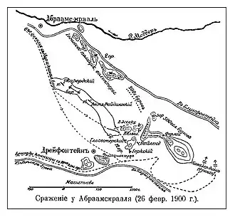 The Boer forces under the command of Christiaan de Wet were holding a 7-mile (11 km) line covering the approach to Bloemfontein. Lord Roberts subsequently ordered a division under Lieutenant General Thomas Kelly-Kenny to attack the position from the front, while Lieutenant General Charles Tucker's division moved against its left flank.[3] The Boers were subsequently forced to withdraw losing 124 men killed and captured, while the British lost 82 killed and 342 wounded.[2][4][5]
