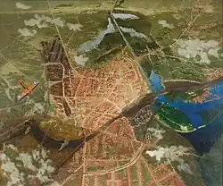 To the north-west, on the east side of the Lens–Bethune road, is a hill about 230 ft (70 m) high with the suburb of Cité St Pierre on top. Hill 70 is north of the city and has a flat top, giving a fine view of the city and the ground to the north and east. The hill slopes gently towards Lens and there is a shallow depression between it and Cité St Pierre. The slopes of Hill 70 towards Cité St Auguste are steeper.[7] Lens, Hill 70, Sallaumines and Sallaumines Hill to the south-east and their commanding views over the area and the city, fell under German control in October 1914, during the Race to the Sea.[8] In September 1915, the British overran the hill during the Battle of Loos but it was recaptured by the Germans.[9]