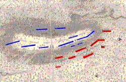 The town of Camden was situated on a gentle elevation. To the south and southwest lay the Wateree River and to the east was Pinetree creek. A ring of redoubts, constructed by the British during their year-long occupation of the town, stretched from the Wateree to the Pinetree and covered the northern approaches.[10] Upon arrival on April 20, 1781 at Camden, it was apparent that the Continentals had lost the element of surprise as Rawdon's forces were prepared on all fronts. Being unable to storm the town or surround the entire circle of fortifications, Greene chose to encamp his army about a mile and a half away on a small elevation called Hobkirk's Hill, blocking Great Waxhaw Road.[11] As he did not have enough men to besiege Camden, Greene, hoping to draw Rawdon into an attack on the position, organized the camp so that battle positions could be taken quickly in the event of an alarm.[8]