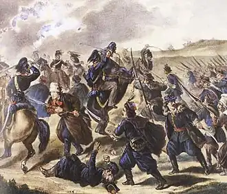 Initial engagements were favorable to the Poles. These included a successful charge by the Zouaves of Death, a unit organized by Francois Rochebrune and led by Wojciech Komorowski in this battle, on Russian positions in the local cemetery. However, charges by the Polish cavalry through the narrow streets of the town resulted in very high casualties in the face of concentrated fire from the Russians and eventually a panic of the Polish troops. According to contemporary Russian reports, 200 insurrectionists died. There were also some reports of atrocities, including the killing or burying alive of the wounded. As a measure of repression, the town was set on fire and local residents were forbidden to put it out.