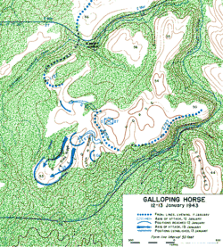 The deep river ravines of the Matanikau's upper forks naturally divided the U.S. 25th Division's operations area into three distinct areas, with one main terrain feature dominating each area. East of the Matanikau was Mount Austen. In the wedge between the southeast and southwest forks of the Matanikau Hills 44 and 43 together formed a terrain feature that the Americans called the "Sea Horse", because of its shape when viewed from above. Between the Matanikau's southwest and northwest forks was a much larger hill mass labelled, also because of its shape, the "Galloping Horse".[43]