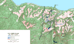 Map of the Matanikau River area showing Japanese (red) and American (blue) positions and the American plan of attack along the coast and into the inland hills