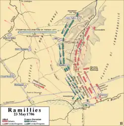 Marlborough, however, noticed several important weaknesses in the French dispositions.[37] Tactically, it was imperative for Villeroi to occupy Taviers on his right and Autre-Eglise on his left, but by adopting this posture he had been forced to over-extend his forces.[38] Moreover, this disposition – concave in relation to the Allied army – gave Marlborough the opportunity to form a more compact line, drawn up in a shorter front between the 'horns' of the French crescent; when the Allied blow came it would be more concentrated and carry more weight. Additionally, the Duke's disposition facilitated the transfer of troops across his front far more easily than his foe, a tactical advantage that would grow in importance as the events of the afternoon unfolded.[38] Although Villeroi had the option of enveloping the flanks of the Allied army as they deployed on the plateau of Jandrenouille – threatening to encircle their army – the Duke correctly gauged that the characteristically cautious French commander was intent on a defensive battle along the ridge-line.[39]