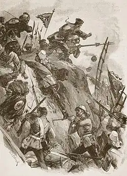 Heavy fighting ensued as the attackers crossed several Chinese ditches and spiked bamboo palisades.