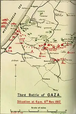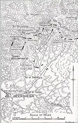 The loss of Beersheba on 31 October stunned the Yildirim Army Group commander and staff.[16]The Beersheba garrison withdrew to the Ottoman defences around Tel es Sheria and northwards to Tel el Khuweilfe, 10 miles (16 km) to the north of Beersheba, and about the same distance east of Sheria, to hold a line stretching from 5 miles (8.0 km) west of the road from Beersheba to Jerusalem. All available reserve units would soon be deployed in the Kuweilfeh area.[17][18][19][20]Here, the Ottoman defenders were able to establish new defences, and the 19th Division was sent from the XXII Corps defending Gaza to reinforce them.[16][b]