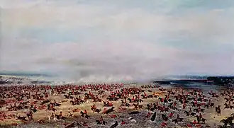 There have been contradictory reports about the casualty numbers and debates over the true values.[8] Centurión, reported that Paraguayan dead numbered about 5,000, maybe more, and the wounded 7,000, while the allies lost 8,000 killed and wounded.[9] Thompson agreed with the number of Paraguayan wounded, but claimed that 6,000 were killed.[10] Other authors give different numbers: in Barreto's opinion 6,500 Paraguayans were killed, while allied casualties were 3,647, with 3,011 Brazilians.[11] According to Silva Pimentel 7,000 Paraguayans were killed.[12] Rawson and Beverina also declared that 7,000 Paraguayans were killed along with "so many others wounded", while the allied casualties were 4,000.[13] Osório's Order of the Day affirmed that the Paraguayan dead numbered "more" than 3,000, with 200 wounded and 21 prisoners; according to this document, Brazilian casualties were 412 killed and 2,003 wounded.