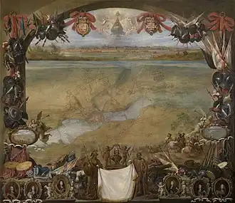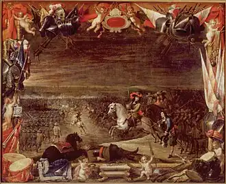 The Battle of Valenciennes became the subject poems, songs, artworks, prints, coins, and publications, including several paintings by Flemish artists like David Teniers II and Pieter Snayers. Teniers, who was the court painter at Brussels, depicted the relief in a canvas using all the topographical, allegorical and rhetorical means of the Baroque imagery.[58] The commanders of the army, including John Joseph, the Prince of Condé and the Marquis of Caracena, were portrayed along a bust of Philip IV. In the painting, John Joseph appears in horseback, performing a levade, a position which makes reference to his leadership abilities.[59] Snayers, a celebrated battle artist, was commissioned to depict the battle in a large canvas. It was owned by the Count of Peñaranda, who had led the Spanish delegation at the Peace of Münster, and, on his death on 1676, it was acquired by Ferdinand Bonaventura von Harrach, Imperial ambassador at the Spanish court.[60] The painting was much celebrated, and the rederijker Cornelis de Bie devoted more space to it in his work Het Gulden Cabinet (1662), a collection of biographical sketches of Flemish and Dutch painters, than to any other painting.[61]