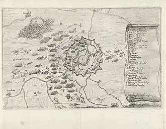 The garrison of Valenciennes consisted of 2,000 infantry and 300 cavalry soldiers led by Alexander de Bournonville, Count of Henin, which were reinforced gradually by 6,000 armed burghers.[19] The Spanish Tercio of Francisco de Meneses Brito was entrusted the guard of the gate of Anzin, on the citadel, which gave access to the river, while Bournonville's own German regiment was positioned to protect the gates of Lille and Le Quesnoy, the Walloon Tercio of the Count de La Motterie was detached to protect the gate of Mons, and the burghers took care of the gate of Famars, the Tourelle —a small palace belonging to the Society of Jesus on the right bank of the Scheldt— and the redoubt of St. Ignace. The Walloon Tercio of Maestre de Campo Verkeest, which was garrisoning the nearby town of Saint-Amand, tried to reinforce Valenciennes, but could not get across the French lines[20]