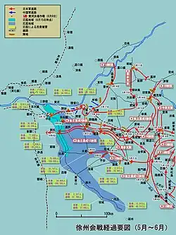 The Battle of Xuzhou was a military campaign between the Empire of Japan and the Republic of China forces in early 1938 during the Second Sino-Japanese War. It lasted for more than three months, with both sides taking heavy casualties and claiming victories. It resulted in an eventual victory for the Japanese, but they failed to destroy the Chinese army, who managed to retreat and regroup to fight later at Wuhan.[11]