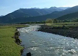 Part of the Alazani River today, showing riverside plains and heavily forested land surrounding it.