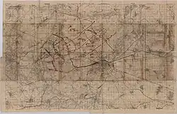 The Canal du Nord defensive system was the Germans' last major prepared defensive position opposite the British First Army.[12] It was a significant obstacle as the Germans had taken measures to incorporate the unfinished canal into their defensive system.[3] Beyond the damage done to make crossing the canal as difficult as possible, north of Mœuvres a lesser arm of the Hindenburg Support Line, the Canal du Nord Line, ran directly behind the east side of the canal.[3] The greater arm of the Hindenburg Support Line crossed the canal at Mœuvres and thus remained well established on the eastern side of the canal south of Mœuvres. This was supplemented by the Marquion-Cantaing Line which ran along a north–south axis one mile east of the canal and the Marcoing Line located just west of Cambrai.[3][14] The attack on the Canal du Nord was to begin on 27 September 1918, a day after the Meuse-Argonne Offensive, one day before the offensive in Flanders and two days before the Battle of St. Quentin Canal.[1]