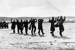 The Israeli task force set out into the Sinai at 14:00 on December 28.[8] This was the first time that many of the soldiers, including Yitzhak Rabin, visited another country. The force consisted, in the order of movement, of the Negev Brigade's 9th Battalion and staff, the 82nd Battalion of the 8th Brigade, and the Negev's 7th Infantry Battalion. Israeli aircraft mistakenly attacked them, killing one soldier and injuring another, until a flag resembling the Israeli (a military flag from the Jewish Brigade) was flown.[7]