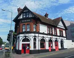 The name of Bear Road comes from the Bear Inn at the foot of the hill, facing the junction with Lewes Road. A pub of that name still occupies the site, but the original building dated from the 18th century and was associated with bear- and badger-baiting at that time.[1] Lewes Road was turnpiked in 1770, but development was slow: the first buildings were the Percy and Wagner Almshouses (1795) south of Elm Grove. Housing reached Bear Road in the 1860s, and in the 1890s and 1900s development spread further north into Preston parish as far as the Patcham parish boundary.[4] At the same time, the steep hillside to the east began to be laid out with working-class housing. Between 1895 and 1899, the north side of Bear Road was lined with houses, and Coombe Terrace became the first new road of housing beyond the two main roads. Between 1900 and 1909, Buller Road, Dewe Road, Ewhurst Road, Ladysmith Road, Nesbitt Road, Redvers Road and Riley Road were laid out in their entirety, and Coombe Road, Milner Road and Natal Road were partly completed. Between 1910 and World War I, Kimberley Road and Mafeking Road were added. Apart from later infill development, the suburb was complete by 1924 with the laying out of Baden Road, Canfield Road, Crayford Road, Eastbourne Road, Carlyle Avenue and the remaining parts of Coombe, Milner and Natal Roads.[15] Canfield Close was built in 1956–59, and the Meadowview area was developed from the 1960s starting with Jevington Drive.[15]