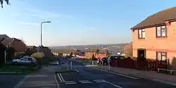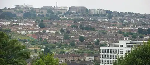 The area north of Bear Road is sometimes described as East Preston, because it was the easternmost section of Preston parish.[3][4] This part developed in the end of the 19th century as a densely populated residential area, and the name Coombe Road area—in reference to another of the main roads—is also used for this part.[5] Meadowview is a late-20th-century housing estate on the northern edge of the area, adjoining Bevendean.[6] The area to the south of Bear Road is covered by two cemeteries.[7] Beyond these are some more terraced residential streets—some of the most densely populated in Brighton—covering the hillside towards Elm Grove (another major west–east road) and the Hanover neighbourhood.[8]