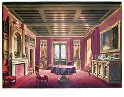 Below the tower is an Italianate building. On the ground floor was the Scarlet Drawing Room and a vestibule with an annexe which housed a kitchen and offices. The first floor held the Crimson Drawing Room, sanctuary and library.[11]
