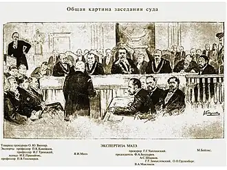 The trial took place in Kyiv from September 25 to October 28, 1913,[1][2][3] and was accompanied, on one hand, by an active antisemitic campaign, and on the other, by nationwide and international public protests. Beilis was acquitted. Researchers believe the true perpetrators were Vera Cheberyak, a fence of stolen goods, and criminals from her home,[4][5][6][7] though this question remains unresolved.[8][9] The Beilis Case became the most high-profile trial in pre-revolutionary Russia.[10]