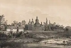 The first monastery in the Eparchy of Turov was the Monastery of Saints Boris and Gleb, established around the mid-12th century.[53] In the same century, thanks to the activity of the bishops of Turov, other monastic centers were established within their jurisdiction.[34] Around the mid-12th century, a male Monastery of St. Nicholas also existed in Turov.[54] Additionally, there was a short-lived female Monastery of St. Barbara in Turov, which was created and destroyed within the 12th century. Possible separate monasteries may have also been founded in Starazhovtsy (south of Turov) and Czernicze, within the city's limits, functioning only in the 12th and 13th centuries.[55]