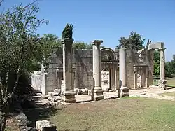 - ^ a b Lieut. H.H. Kitchener [1850-1916], "Lieutenant Kitchener's Reports: IV - P.E.F. Camp, Taiyebeh, 30th May, 1877," Palestine Exploration Fund Quarterly Statement 9.4 (Oct. 1877): 166: "The entrance was probably in the centre of the eastern side, where two columns are squared on the outside--it was probably double, with a round column between. The end columns at both ends of the colonnade were squared on the outside, forming a double column on the inside, exactly the same as in Jewish synagogues, such as at Kefr Ber'am, where the southern columns of the portico were two double columns corresponding with those at the north end of the building. Another point of resemblance is the direction of the colonnade, being within twelve degrees of north and south."