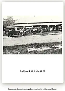 The Bellbrook Hotel overlooks the Macleay River.[12] Opening in 1913,[13] the Bellbrook Hotel is of historical significance, enjoying over one hundred years of service in addition to its notoriety as the watering hole of renowned Country Music Singer Slim Dusty.[14] In 2018, the pub was nominated for the Best Bush Pub category in the Australian Hotels Association 2018 awards for excellence.[15] In the same year, Bellbrook Hotel featured as one of twenty-five historic pubs in a travel book by the publisher of Australian Bush Pubs, titled, 'Historic Pubs, New South Wales'.[16]