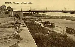 The Belvárosi Bridge in Szeged, Hungary, is the main bridge of the city, connecting Újszeged, on the left bank of the river Tisza, to the other quarters. It was the only crossing on the river in the County until the finishing of the Bertalan Bridge in 1979. Every year in May the Hídivásár (Bridgemarket) is held there, drawing thousands of visitors to the city.