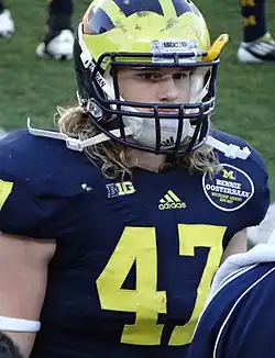 Bennie Oosterbaan's jersey number 47 was the first Michigan football jersey number retired,[15] and until 2011, it was one of only five numbers retired by the Michigan football program. In 2012, the Michigan Football Legends program led to the reissue of the No. 47 jersey to linebacker Jake Ryan, bearing a patch (pictured at right) honoring Oosterbaan. Each player to wear the jersey will also dress at a locker bearing a plaque with Oosterbaan's name and his time of tenure at Michigan.[27][28]