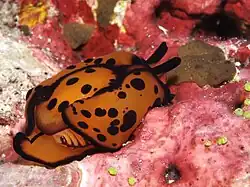 This species can grow up to a length of 6 cm (2.4 in). The background coloration of the body varies a great deal, from light orange-brown to black or whitish to cream in color. The body is always marked with dark or clear spots, according to what is the dominant background color. The mantle, which covers the body, is composed of four distinct parts: dorsal, anterior, and two lateral pieces protecting the gills. These lateral pieces are on the right side of the body; they have the same coloration as the body, but are outlined in black.