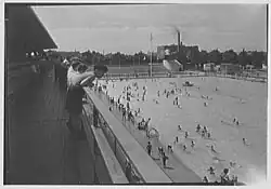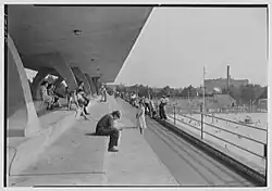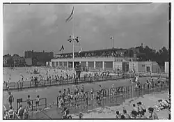 Construction for some of the 11 pools began in October 1934.[40][38] Even though there was already a pool at Betsy Head Park, Moses described its existing pool facilities as "an antiquated tank" that contained no filtration facilities; he proposed to refurbish it entirely as part of the WPA initiative.[19][20] The existing field house largely remained intact, except for some modifications to make way for an enlarged pool. The field house's lockers were replaced by baskets, and its interior was expanded so that 4,660 bathers per day could use the facilities, rather than 4,000.[41] By mid-1936, ten of the eleven WPA-funded pools were completed and were being opened at a rate of one per week.[33] Except for the Betsy Head Pool, each opening featured elaborate performances attended by La Guardia.[41] Betsy Head Park's pool was the ninth to open citywide.[42][43][a] On August 7, 1936, Betsy Head Park's pool area opened without any ceremony or the mayor in attendance; over eight hundred children spread the news of the opening by word of mouth. The opening was arranged at the last minute, and the diving and wading pools were not yet complete.[44][45][46]