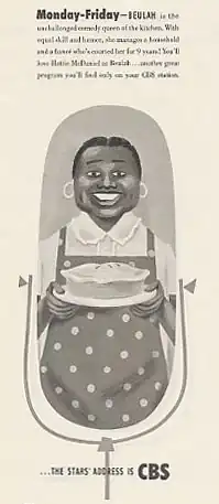 This ad depicts a turning point in media history on November 24, 1947, the first instance of an African American woman starring in a network radio program, with ad copy noting that she is "queen of the kitchen" and "manages a household".
