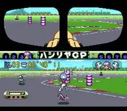 There are items when going through a "pit-stop" on the track and the racing itself is complex, with drifts and wheelies. The player can choose from eight characters of various appearances and has a fuel gauge to watch while playing the game. Two views are present; a first-person view through the motorcycle rear-view mirrors and a second view using a more conventional third-person view. Other than the number of laps and the lap time, all other information is in Japanese.