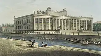 The defining characteristic of the Bildungsbürgertum, including how it perceived itself, was its engagement with culture. Its education was based on specific canons that were both shaped and embraced by the Bildungsbürgertum. Social interaction in theatres, opera houses, concert halls, and museums in large cities became a defining characteristic of their milieu. The institutions often owe their founding and financial support to the patronage of the Bildungsbürgertum. They campaigned for the construction of cultural buildings, which – often designed in a classical, temple-like style – became extended public salons of social and political life, such as Museum Island in Berlin (1830), the Vienna State Opera (1869) and the Städel in Frankfurt am Main (1833).[8] In smaller regional centres, too, private and municipal theatres were established, with orchestras that brought opera and concert performances to the provinces.