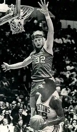 Walton's professional career, however, was significantly hampered by foot injuries, requiring numerous surgeries (Walton underwent 37 orthopedic surgeries in his lifetime).[1][2][3] As a result, Walton only played in 468 out of 1,148 possible regular season games across his 14-year NBA career.[4] After his MVP season, Walton sat out the 1978–79 season and was then signed by the Clippers, for whom he played four injury-plagued seasons. His career was rehabilitated during two seasons with the Celtics at the end of his career. Playing as a backup center behind Robert Parish, Walton earned the NBA Sixth Man of the Year Award in the 1985–86 season and contributed significantly to the Celtics' playoff run that year, culminating in his second NBA championship.[5] He was named to the NBA's 50th and 75th anniversary teams.[6][7]