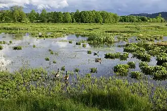 Sea life features 18 species of fish[12] located in one of three habitats: riverine, estuarine, or the Nisqually Reach nearshore. Large populations of fall Chinook salmon, starry flounder and shiner perch offer a sampling of the fish that are abundantly available.[13] The saltmarshes and mudflats are located outside of the dikes. Rich in nutrients, they are the home to clams, crabs, shrimp and worms, which in turn feed ducks, gulls and herons. Over 20,000 birds, made up of 275 different migrating species, use the freshwater marshes and grasslands for breeding, resting or wintering. The most abundant bird types include raptors, shorebirds and songbirds. Larger animals such as hawks and coyotes feast in the grassland due to the presence of mice and voles. The riparian woodland and brush habitats contain many amphibians, mammals and reptiles.