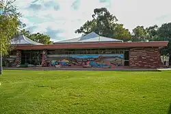 A view of Kenda's artwork on the side of the Alice Springs Public Library; 2024