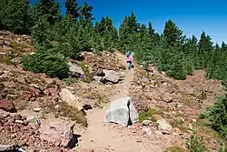 The Black Crater Trail runs one-way for 3.8 miles (6.1 km) from a trailhead on Oregon Route 242. It passes through the Three Sisters Wilderness and eventually reaches the summit of Black Crater, where the North Sister and Mount Washington volcanoes can be seen.[13] The trail can be hiked or attempted on horseback, but mountain bikes and motorized vehicles are not permitted.[13] Considered to be of intermediate difficulty for hiking, it takes on average about 4 hours to complete, ranging in elevation from 4,900 to 7,251 feet (1,494 to 2,210 m).[43] The southeastern portion of the trail can be skied.[43] Since 1905, All recreational activity at Black Crater has been overseen by the United States Forest Service. Forest rangers built a fire lookout tower in 1925, but it was out of service by the 1960s.[44]
