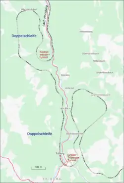 Between Offenburg and Hausach, the Black Forest Railway follows the river Kinzig, and runs right next to it near Gengenbach. The section between Offenburg and Gengenbach is flanked by expansive vineyards, which slowly dwindle away as the Kinzig Valley narrows. The line then runs through the Gutach valley to Hornberg. From Hornberg to Sankt Georgen, the route must negotiate numerous loops, many through tunnels, and transcends several hundred metres in altitude in the process. This section is clearly visible from a lookout point near Triberg.