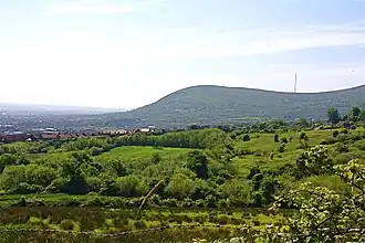 Black Mountain is a large hill which overlooks the city of Belfast, Northern Ireland. With a height of 1,275 ft (389 m),[1] it towers over most of west Belfast and is part of the Belfast Hills. Its name is probably derived from the adjoining mountain called Divis (/ˈdɪvɪs/; from Irish Dubhais 'black ridge'), and they may have been seen as one mountain in the past.[2] Black Mountain transmitting station is on the summit.