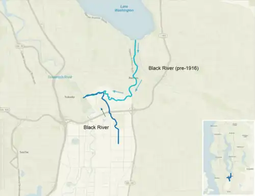 The Black River is a tributary of the Duwamish River in King County in the U.S. state of Washington. It drained Lake Washington until 1916, when the opening of the Lake Washington Ship Canal lowered the lake, causing part of the Black River to dry up. It still exists as a dammed stream about 2 miles (3.2 km) long.[1]