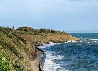 One of the notable characteristics of the Black Rock shoreline is Red Bluff. The bluff's name comes from the oxidised iron in the cliffs which gives off a burnt orange colour. Either side of Red Bluff are many popular beaches and seaside destinations, including Half Moon Bay, a setting for yachting since the 1890s. A branch of the Brighton Yacht Club formed the Black Rock Yacht Club in 1919. A rock breakwater was constructed and in 1926 the hull of the colonial naval vessel HMVS Cerberus was added to further protect the boat haven.
