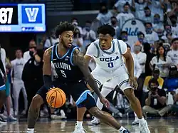 Justin Moore of Villanova being defended by Jaylen Clark of UCLA. Their two teams are often debated as blue bloods.