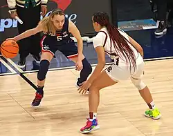 Paige Bueckers of UConn being guarded by Brea Beal of South Carolina in the 2022 national championship game.