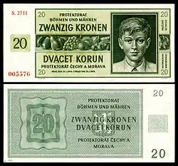 Czechoslovak banknotes for 1 koruna and 5 korun were stamped (and later printed) with "Protektorat Böhmen und Mähren" over "Protektorát Čechy a Morava," and subsequently issued in Bohemia and Moravia beginning on February 9, 1940.[8] These were followed by regular government issues of 1, 5, 50 and 100 korun in 1940,[9] 10 korun in 1942,[10] and 20 and 50 korun in 1944.[11] Nationalbank für Böhmen und Mähren in Prag (National Bank for Bohemia and Moravia in Prague) introduced 500 and 100 korun notes in 1942, followed in 1943 by overprinted Czechoslovak 5000 korun notes. In 1944, the National Bank issued regular 5000 korun notes.[11]