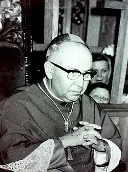Soon after, on 26 April 1951, Pope Pius XII appointed Kominek titular bishop of Sophene and "Pastoral Representative" with residence in Wrocław.[2] However, the Communist regime forbade him taking up residence there and from being consecrated. Nevertheless, Kominek was secretly consecrated as bishop on 10 October 1954 at the hands of Bishop Franciszek Barda, with Bishops Franciszek Jop and Wojciech Tomaka serving as co-consecrators. The consecration was kept secret until 1956, when he could finally move to Wrocław and was appointed on 1 December titular Bishop of Vaga. On 19 March 1962 he was raised in rank by being named titular Archbishop of Euchaitae[2] and on 25 May 1962 was appointed apostolic administrator ad nutum Sanctae Sedis. On 28 September 1958, he and Bishop Jop were co-consecrators at the episcopal consecration by Archbishop Eugeniusz Baziak of Karol Wojtyla, the future Pope John Paul II, as an auxiliary bishop of the Archdiocese of Krakow.[2]