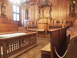 • The volume, without the roofs, can be calculated as a sum of five cuboids, one single (the central nave) and two pairs (the aisles and the files of chapels). The sum of each of the pairs can be calculated as one cuboid of double width. Knowing the height of the central nave and the width of the building, the measures of the sections can be calculated by measuring an orthograde photo of the facade.