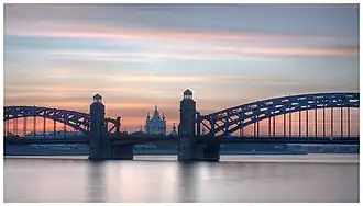Bolsheokhtinsky Bridge (Russian: Большеохтинский мост, before 1917 - Peter the Great Bridge, Russian: Мост Петра́ Вели́кого, Most Petra Velikogo; from 1917 to 1956 - Bolsheokhtensky Bridge, Russian: Большеохтенский мост; also known as Okhtinsky Bridge, Russian: Охтинский мост) is a bridge across the Neva River in Saint Petersburg, Russia. The bridge's length is 334 meters, the width is 23 meters. The bridge features three spans; the central one can be drawn.
