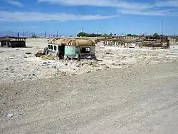 Bombay Beach's decline began in the 1970s, when the runoff (full of salty chemicals) led to a warning that the salinity of the lake would no longer sustain wildlife; that occurred by the early 1980s. Many residents around the Salton Sea, including those in Bombay Beach, were eventually driven out by the odor of the dying fish, the fear of health problems, and the flooding and the draining of the Salton Sea. Many of the remaining residents are reportedly either too poor to move out or too attached to the history of the area to leave.[9][10] A report by the Pacific Institute in September 2019 stated that ten years earlier, "there were some 100 million fish in the Sea. Now, more than 97 percent of those fish are gone."[11]
