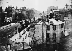 Boulevard du Temple is a photograph of a Parisian streetscape made in 1838 (or possibly 1837[1]), and is one of the earliest surviving daguerreotype plates produced by Louis Daguerre.[2] Although the image seems to be of a deserted street, it is widely considered to be the first photograph to include an image of a human.[3][4]
